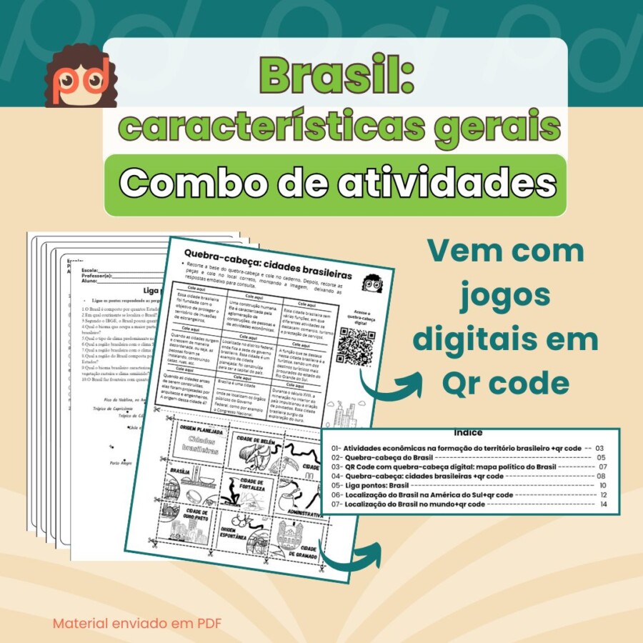 O material reúne 6 atividades imprimíveis e 5 atividades digitais (via QR Code),com temas diversos de introdução ao Brasil.